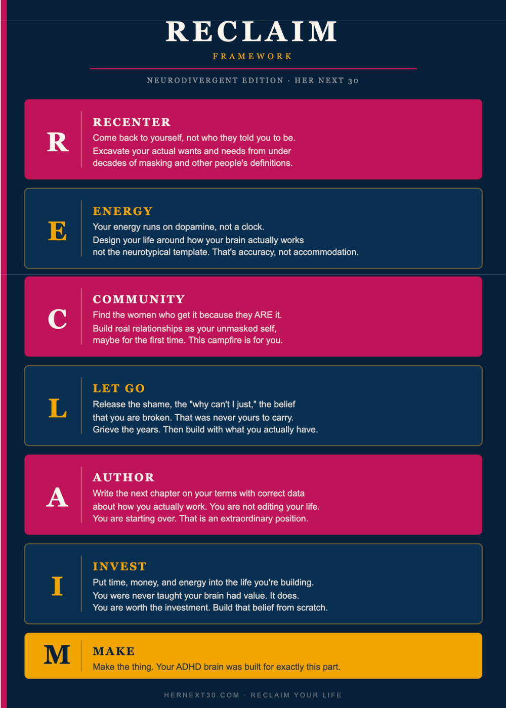 RECLAIM is the backbone of Her Next 30, a community built specifically for midlife women with late-diagnosed ADHD who are done shrinking and ready to reclaim their lives. Seven things most of us quietly gave away during the years we were busy performing neurotypicality. Seven things we get to take back.