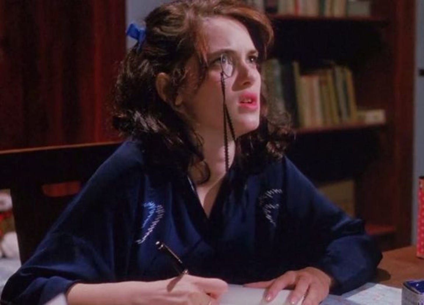 She’s the one in the corner with the monocle and the journal, watching everything unfold with an expression that sits right between exhausted and appalled.